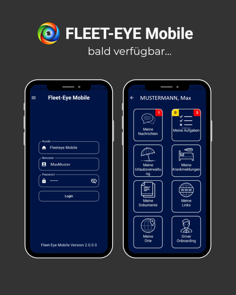 Aktuell wird an einem neuen Design für die Fleet-Eye Mobile App gearbeitet. Durch das neue Layout wird das Bedienen und Navigieren durch die App noch einfacher und effizienter.